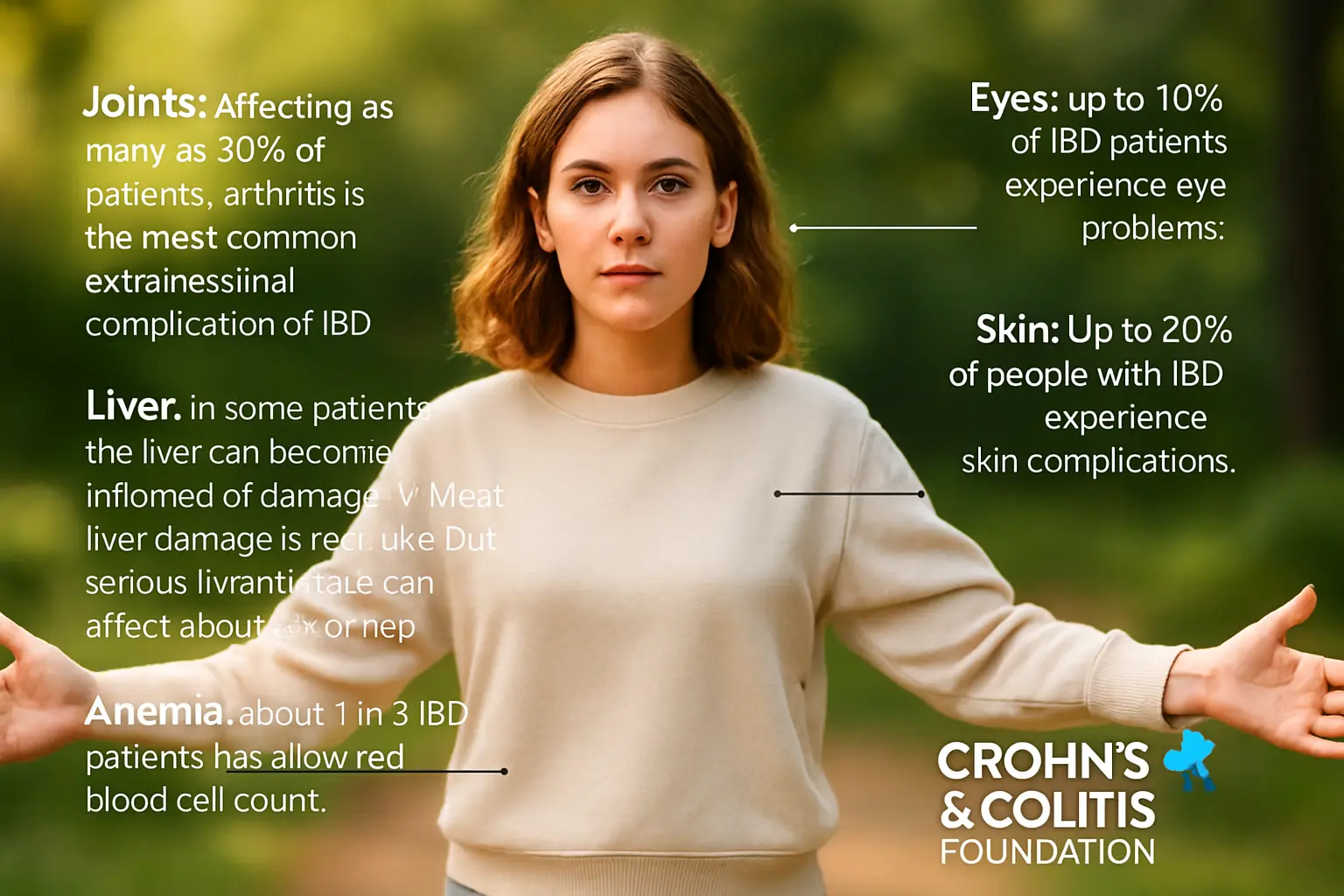 Because of ongoing inflammation, Crohn’s can lead to a slew of nasty gut issues: ulcers, perforations, fistulas, abscesses, and stenoses (that’s a fancy word for inflammatory narrowing in the digestive tract). Symptoms peak during flare-ups and can be so intense that daily life grinds to a halt. The gut may be the main battlefield here, but, as many discover, Crohn’s isn’t content to stay in one lane.